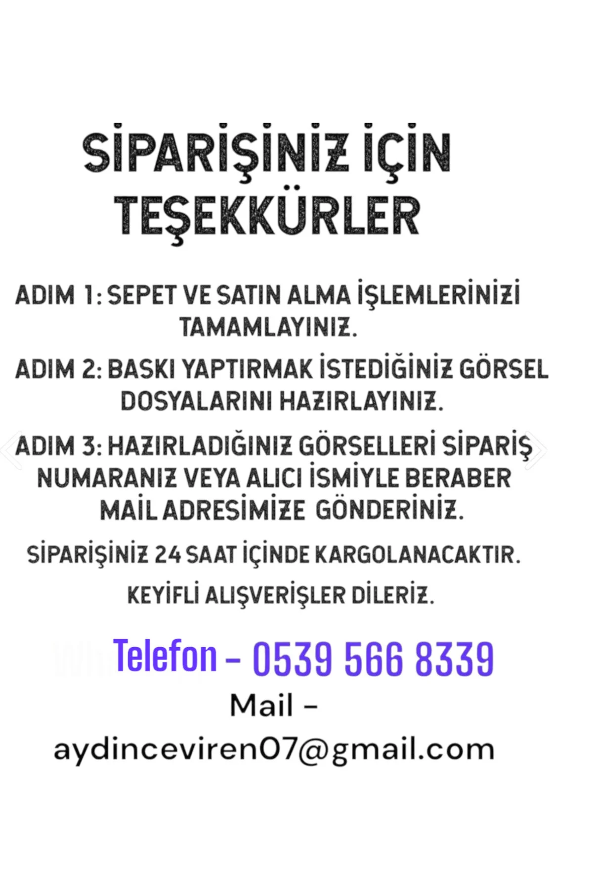 SİPARİŞİNİZ İÇİN TEŞEKKÜRLER ADIM 1: SEPET VE SATIN ALMA İŞLEMLERİNİZİ TAMAMLAYINIZ. ADIM 2: BASKI YAPTIRMAK İSTEDİĞİNİZ GÖRSEL DOSYALARINI HAZIRLAYINIZ. ADIM 3: HAZIRLADIĞINIZ GÖRSELLERİ SİPARİŞ NUMARANIZ VEYA ALICI İSMİYLE BERABER MAİL ADRESİMİZE GÖNDERİNİZ. SİPARİŞİNİZ 24 SAAT İÇİNDE KARGOLANACAKTIR. KEYİFLİ ALIŞVERİŞLER DİLERİZ. Telefon - 0539 566 8339 Mail aydinceviren07@gmail.com