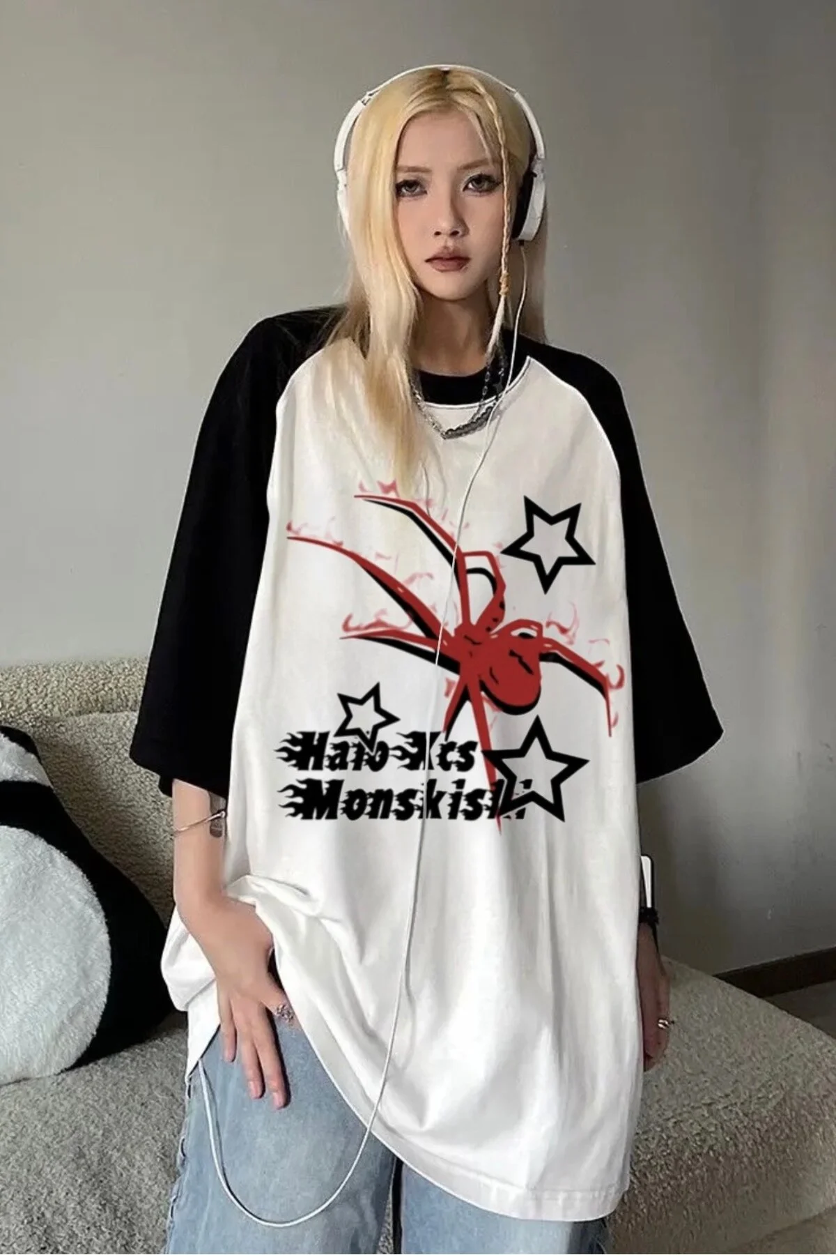 Beyaz Unisex Siyah Reglan Streetwear Spider Halo Star T-Shirt