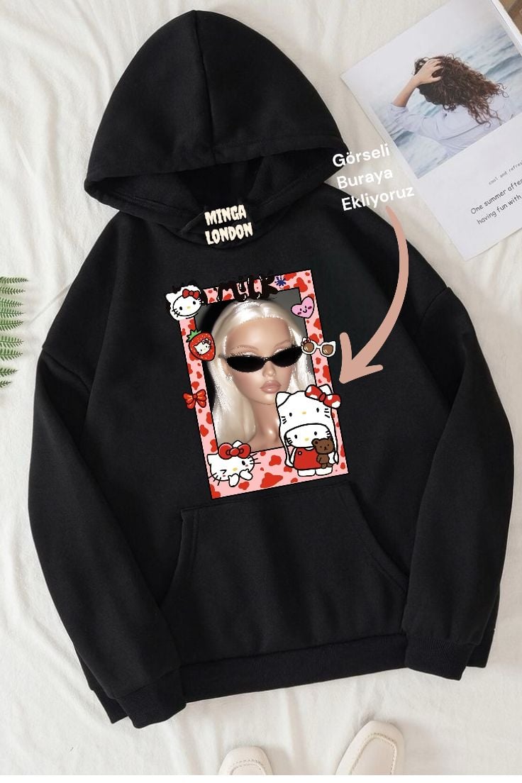 Kişiye Özel Siyah Hello Kitty Çerçeve Baskılı Oversize Sweatshirt
