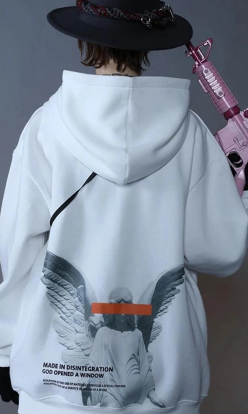 Retro Angel Baskılı Kapşonlu Beyaz Sweatshirt