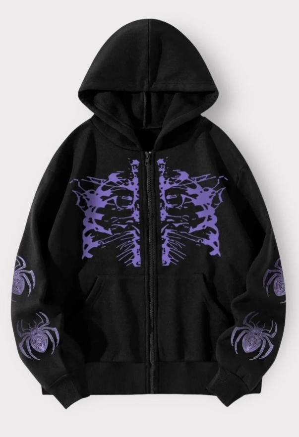 Siyah Örümcek Kol Baskılı İskelet Hırka