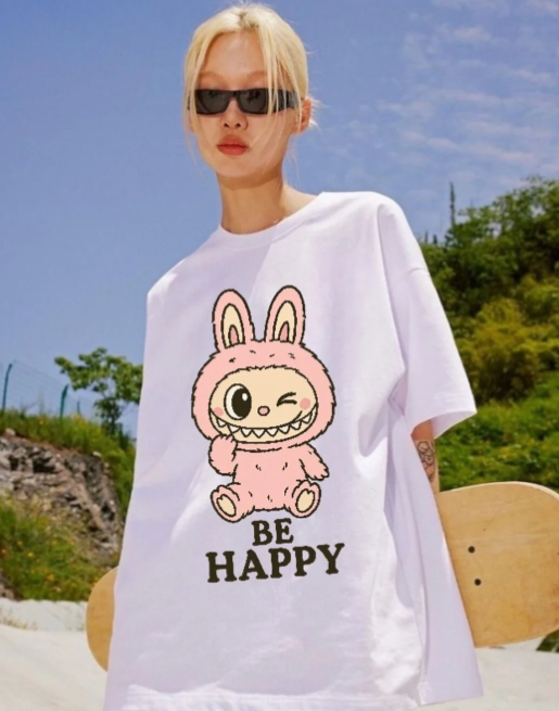 Unisex Be Happy Labubu Baskılı Bisiklet Yaka T-Shirt