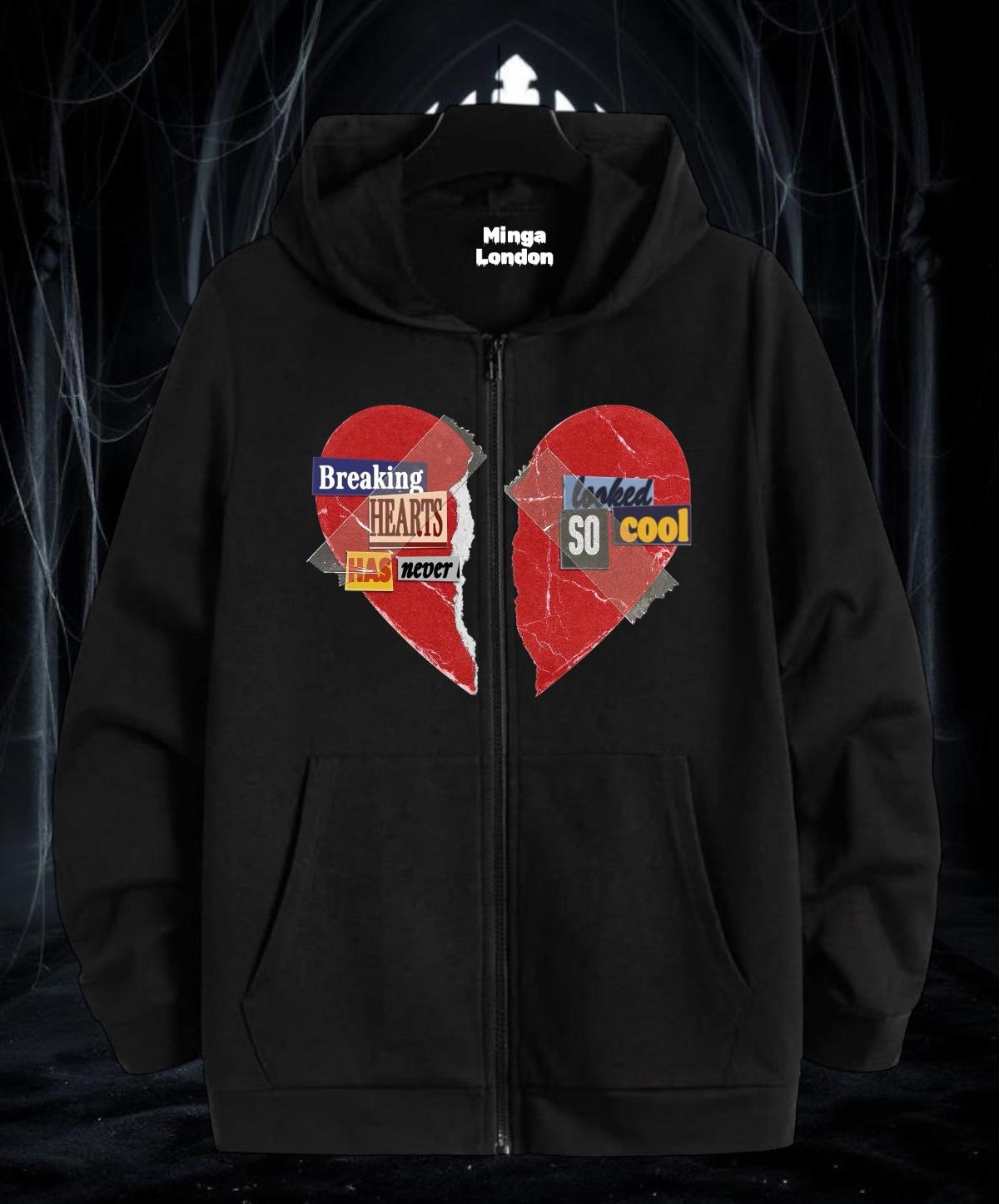 Unisex Kalp Stil Baskılı Siyah Oversize Fermuarlı Sweatshirt Hırka