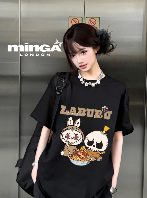Unisex Labubu Ramen Baskılı Bisiklet Yaka T-Shirt