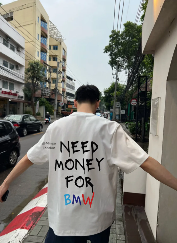 Unisex Need Money For BMW Baskılı Baskılı Bisiklet Yaka Oversize T-Shirt